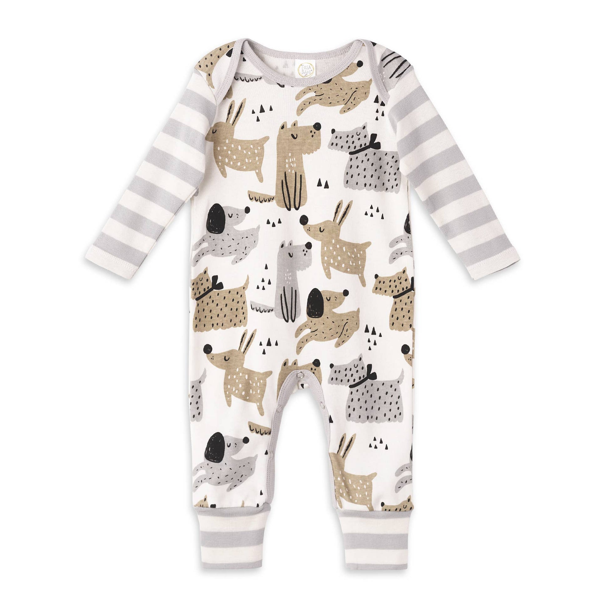 Baby boy romper with puppy dog print and grey stripe trim. Super-soft 100% cotton rib material is oh-so-gentle against baby's skin. Romper snaps underneath for changing ease.
