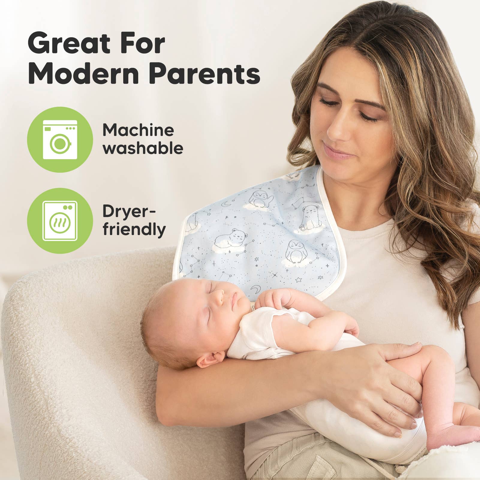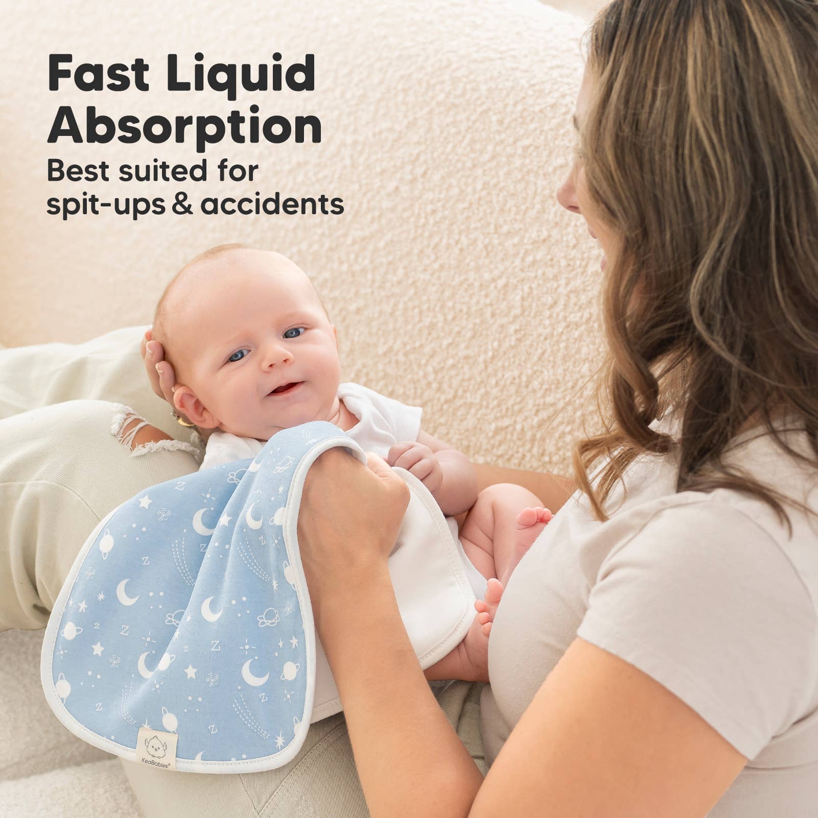 Our KeaBabies Urban Organic Burp Cloths are the perfect burping cloths for babies. Filled with quality fleece for optimum absorption, the highly soft and absorbent burp cloths keeps parents fresh and dry from spit ups, drool or puke. Sized at 21" x 10", these large burp cloths are wide enough to cover your shoulders and the unique figure-8 design prevents these spit up rags from slipping. Made with 100% organic cotton on both sides of the burp cloth, it is safe for your newborn baby's sensitive skin. These burp rags are machine washable and are sold in pack of 5 in a sustainable kraft gift box.
