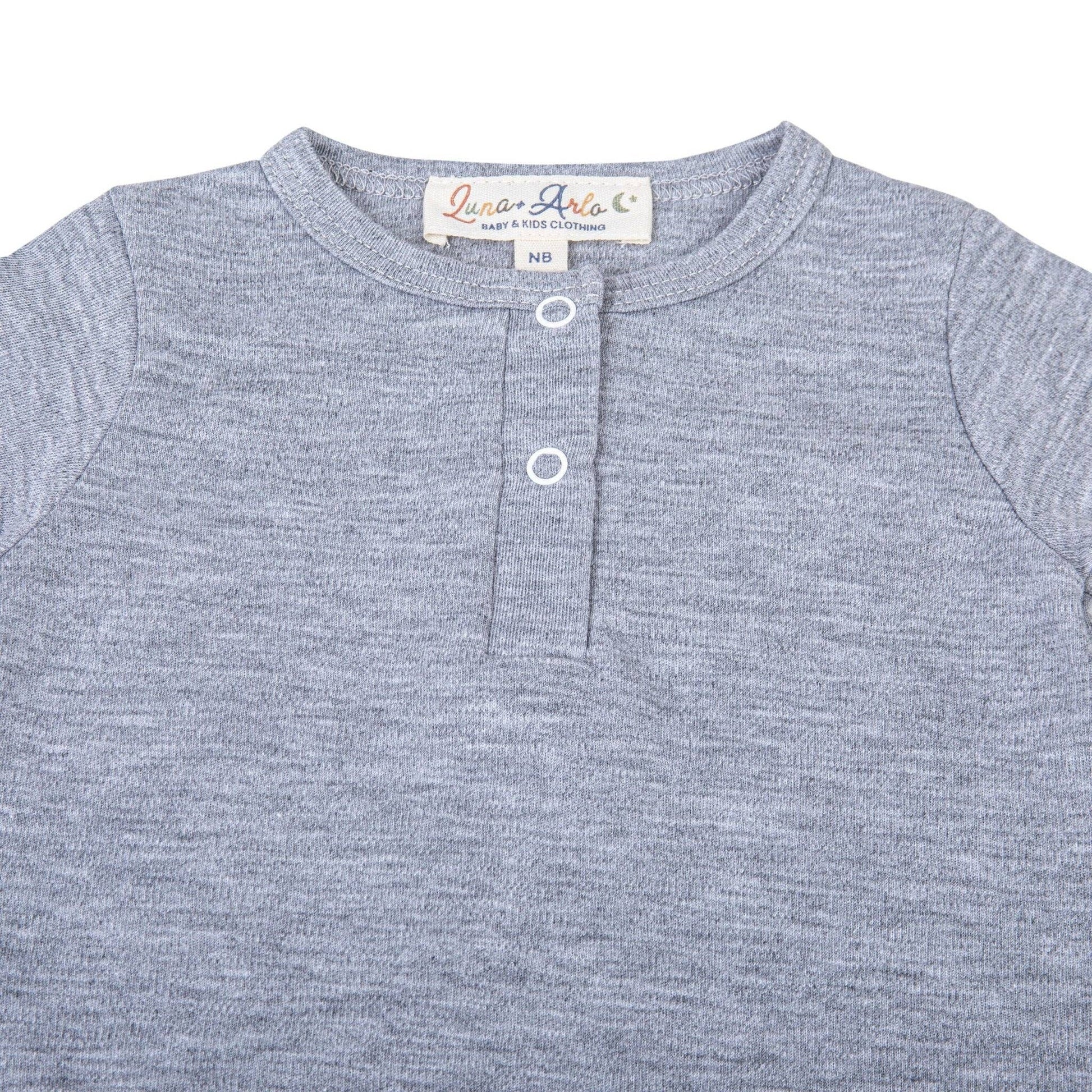 Luna & Arlo Pima Cotton Playsuit – Slate - Effortless and cozy, the Luna & Arlo Pima Cotton Playsuit in slate is crafted from premium 100% Peruvian Pima cotton. This modern one-piece features a henley front and hidden snaps for easy changes, while the soft, gender-neutral tone makes it perfect for monogramming or embroidery. A versatile piece for retailers—great alone or styled in a bundled display with matching accessories. Details: 100% Pima cotton, made in Peru Henley neckline with snap placket Inseam snaps for easy diaper access Great for personalization
